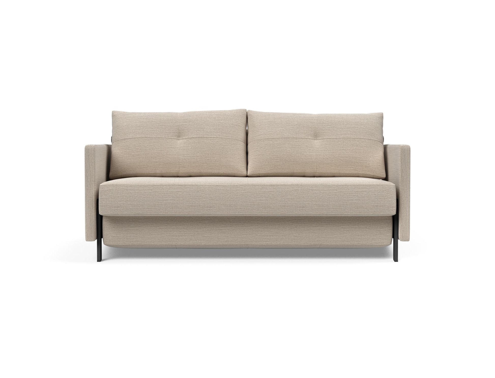 This compact sofa bed is designed with a modern and minimalist aesthetic, perfect for small living spaces. It effortlessly transforms from a stylish sofa with armrests into a comfortable bed for guests. The piece is a perfect combination of comfort, style, and practicality.